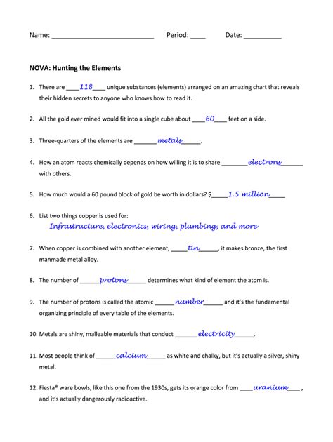 Download nova hunting the elements worksheet answer key Doc